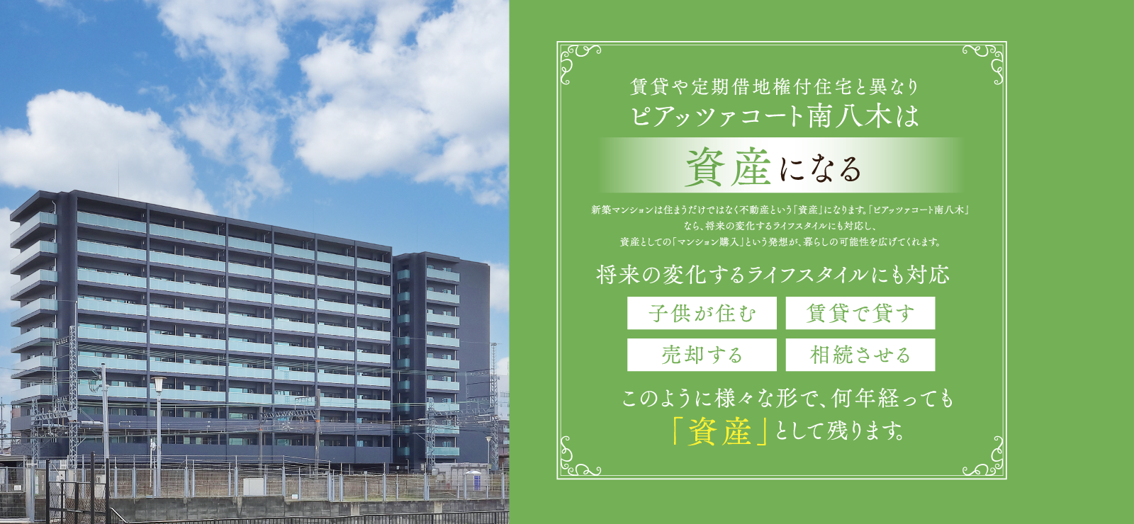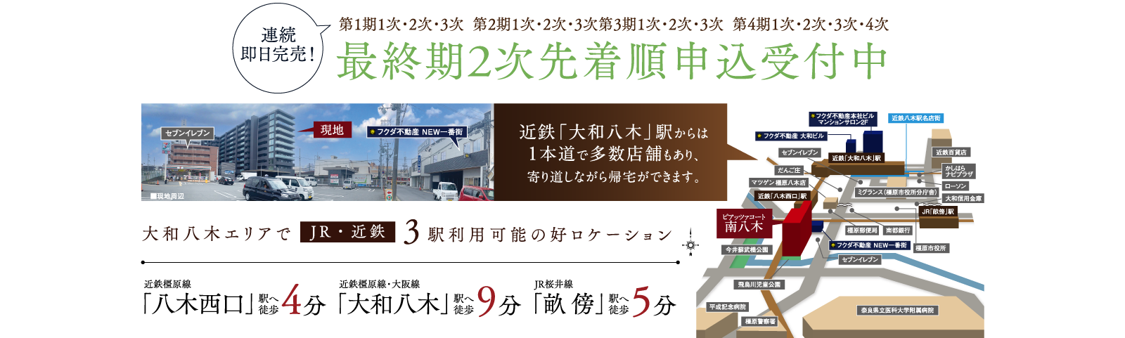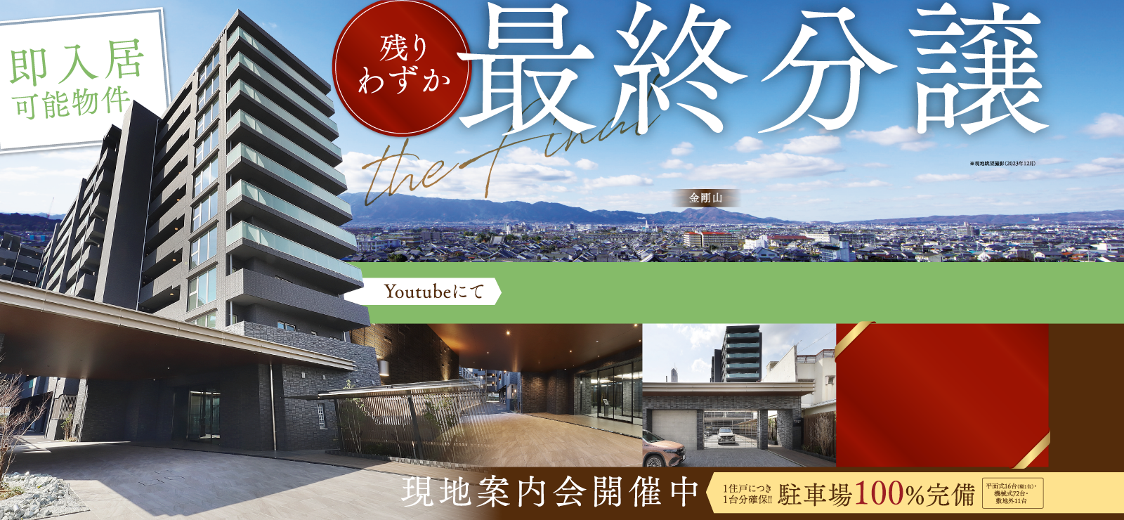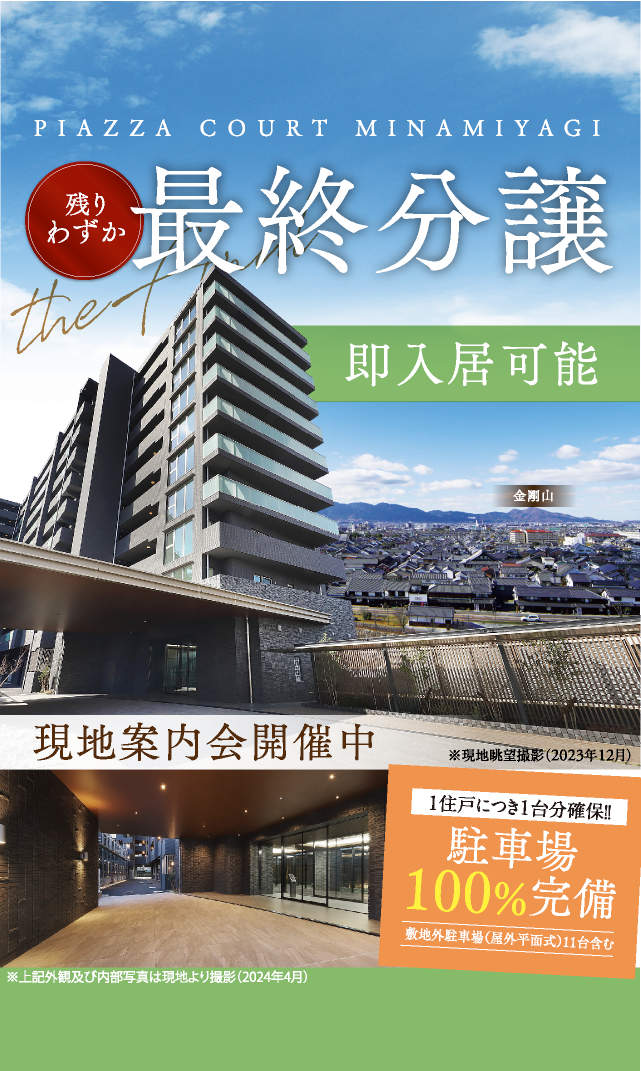 NEWS 2025/04/25最終期1次分譲受付を開始いたしました。 2025/03/14第4期4次分譲受付を開始いたしました。 2024/10/25第4期3次分譲受付を開始いたしました。 2023/12/22第3期3次分譲受付を開始いたしました。 2023/06/30第2期1次分譲受付を開始いたしました。 2023/05/08第1期2次分譲受付を開始いたしました。 2023/05/03第1期一次分譲受付を開始いたしました。 2023/04/21事前案内会を開始いたしました。 2022/12/15公式ホームページ公開!資料請求の受付を開始しました。 ※1.近鉄橿原線「大和八木」駅最寄りでは11年ぶりの供給となります。(2022年10月現在MRC調べ)※掲載の完成予想図は施工上の都合等により、建物の形状、色調、植栽、調度品等に変更が生じる場合がございます。あらかじめご了承ください。 3Dモデルルーム公開中 資料請求者様 限定コンテンツ 未公開間取りや建築パースなど限定情報をいち早く公開中! お届けする閲覧パスワードにて限定公開ページをご覧いただけます。